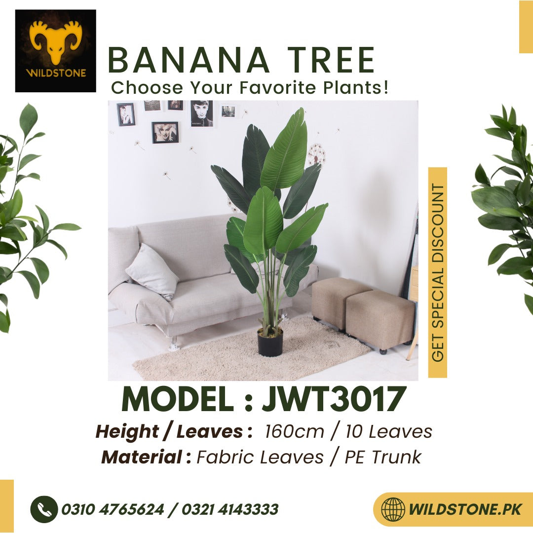 The JWT3017 features 10 leaves made from high-quality fabric material. Each leaf is intricately designed to replicate the broad shape, vibrant green color, and distinctive texture of real banana tree leaves. The fabric leaves provide a lifelike appearance and a soft, realistic touch, enhancing the overall visual appeal of the plant.