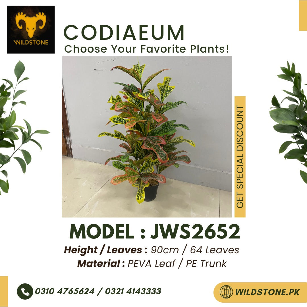 The JWS2652 features 64 leaves made from high-quality PEVA material, meticulously designed to replicate the intricate patterns and glossy texture of real Codiaeum leaves. Each leaf is crafted with precision and attention to detail, capturing the vibrant colors and unique markings that make Codiaeum plants so visually appealing. The PEVA leaves provide a lifelike appearance and ensure durability, allowing the plant to maintain its pristine condition over time.