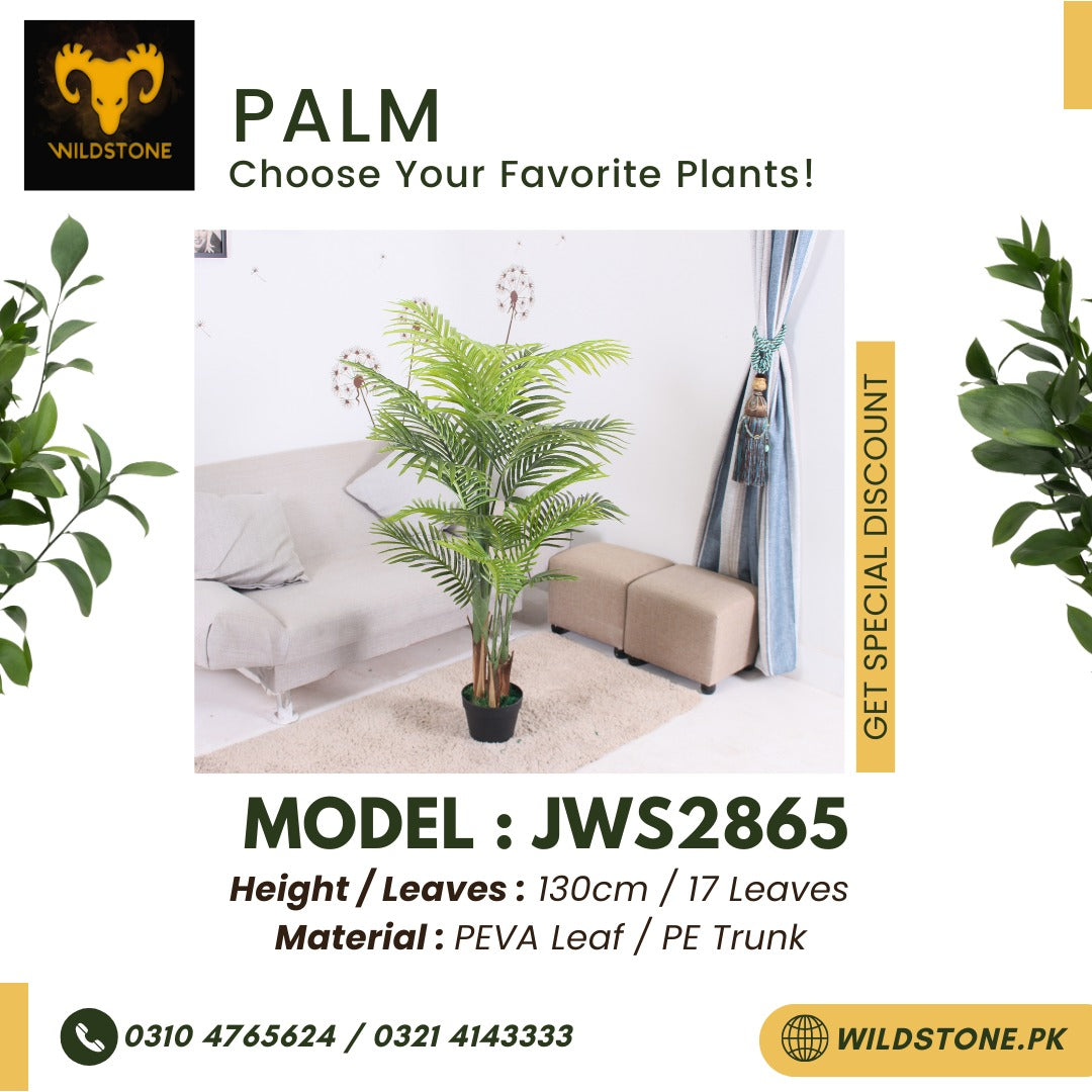 The JWS2865 features 17 leaves made from high-quality PEVA material, skillfully designed to replicate the natural texture and lush green color of real palm leaves. Each leaf is intricately shaped and arranged to capture the graceful curvature and delicate details that are characteristic of palm foliage. The PEVA leaves not only provide a lifelike appearance but also ensure durability, allowing the plant to maintain its beauty over time.